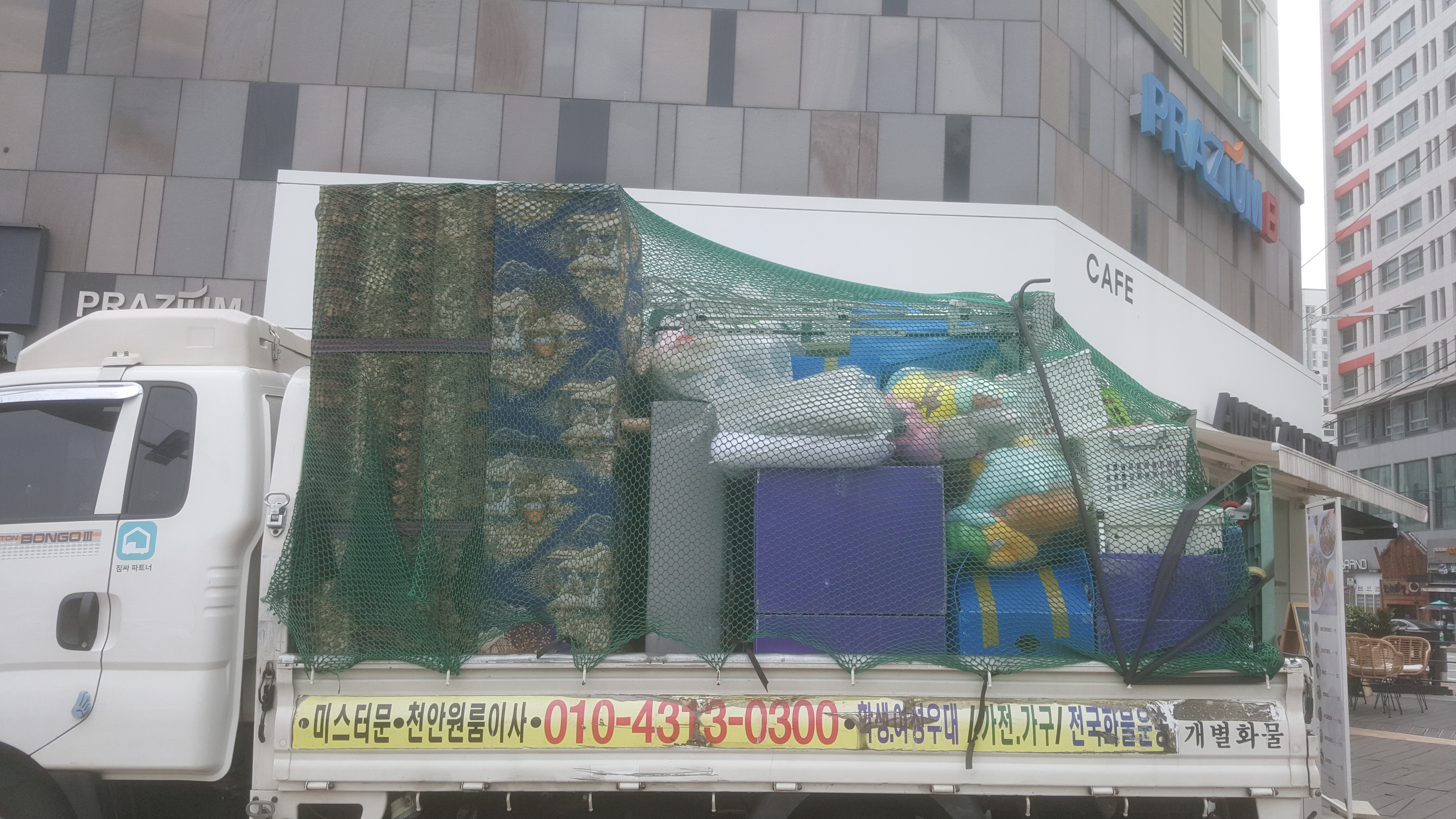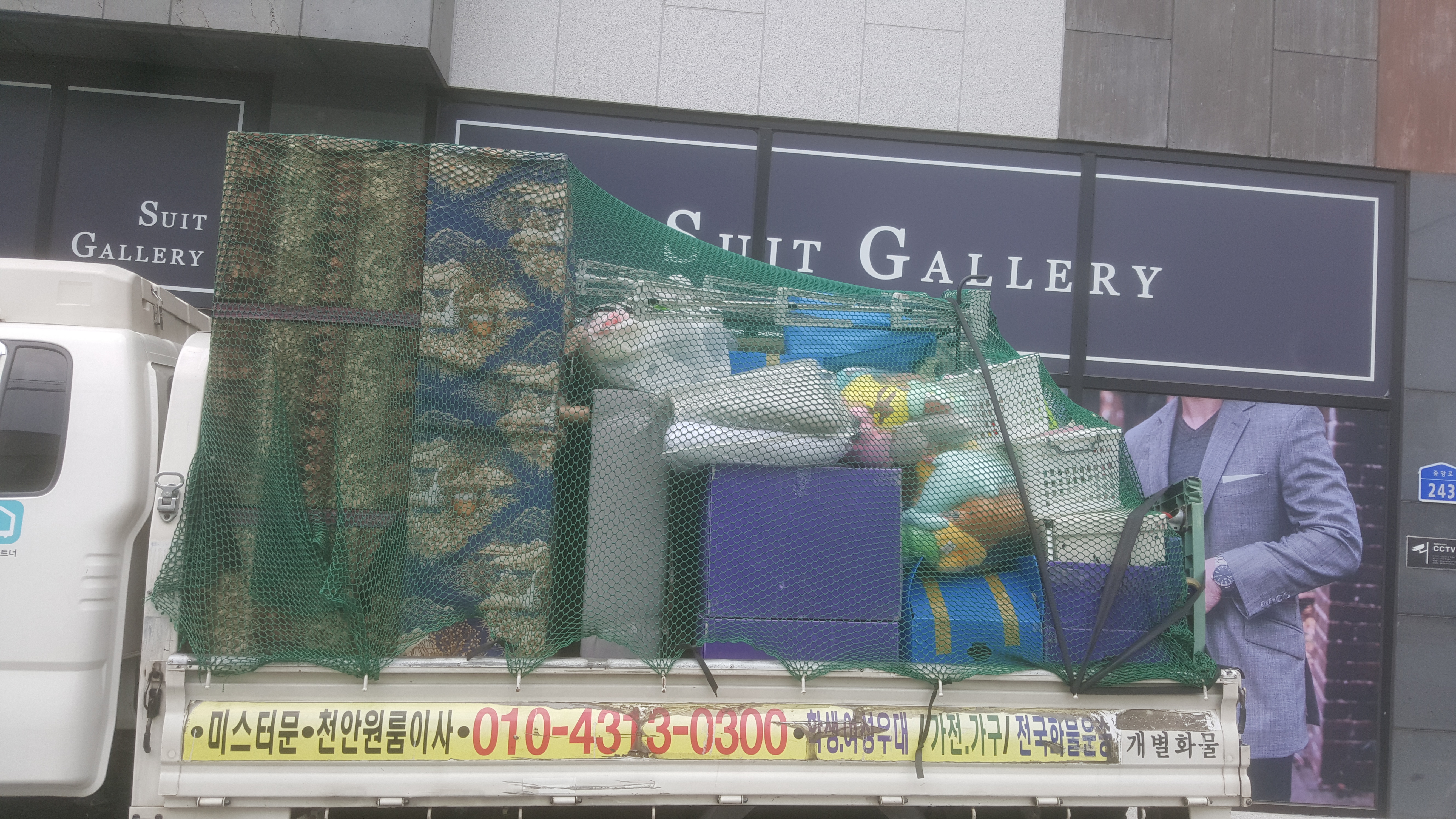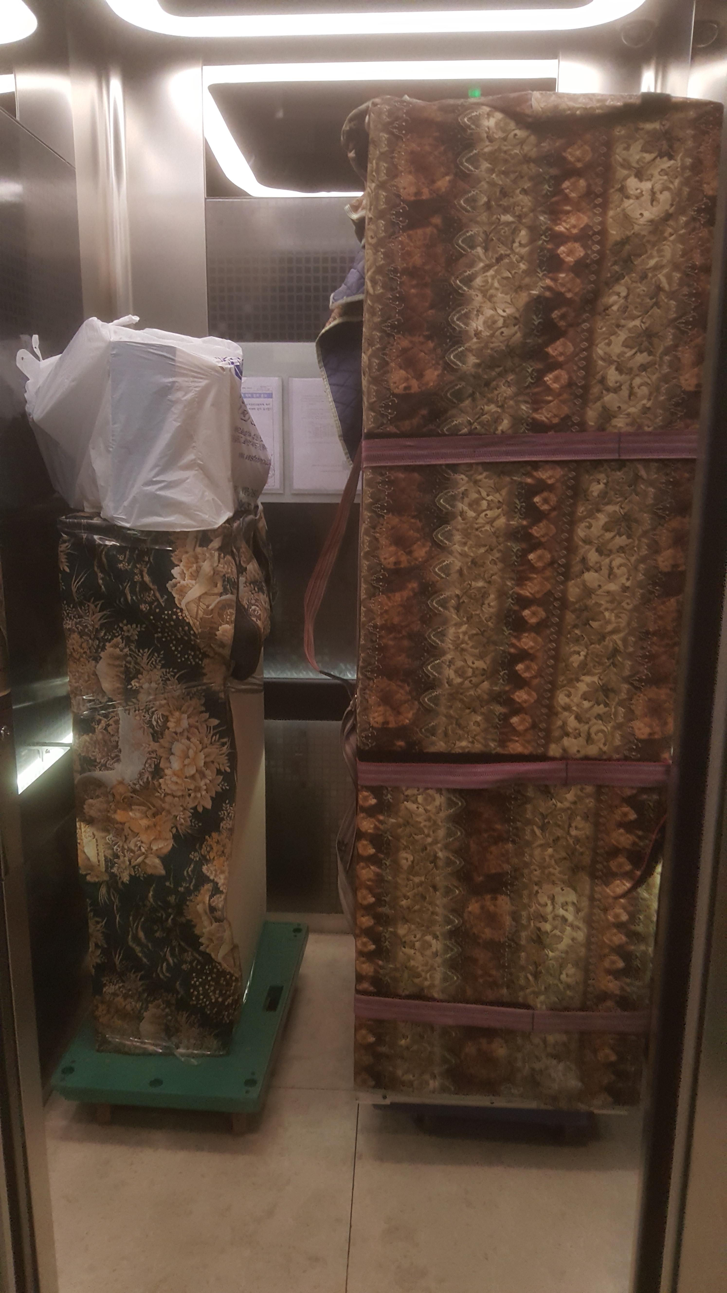 2층엘리베이터로 운반작업을 통해 이동하여 공동현관문 입구 앞에 주차된 테트리스용달트럭에 빈틈없이 실코 안전그물망으로 모두 덮고 칭칭 결박한 후
